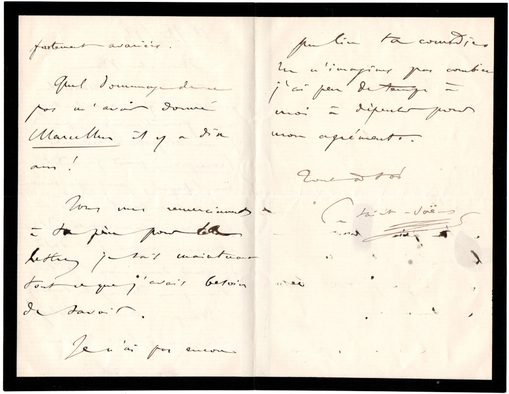 Saint-Saëns seems to have had problems with his pen, as, under his signature, the page shows some offsetting from the opposite page, as well as some large ink-blots to the last (blank) page.